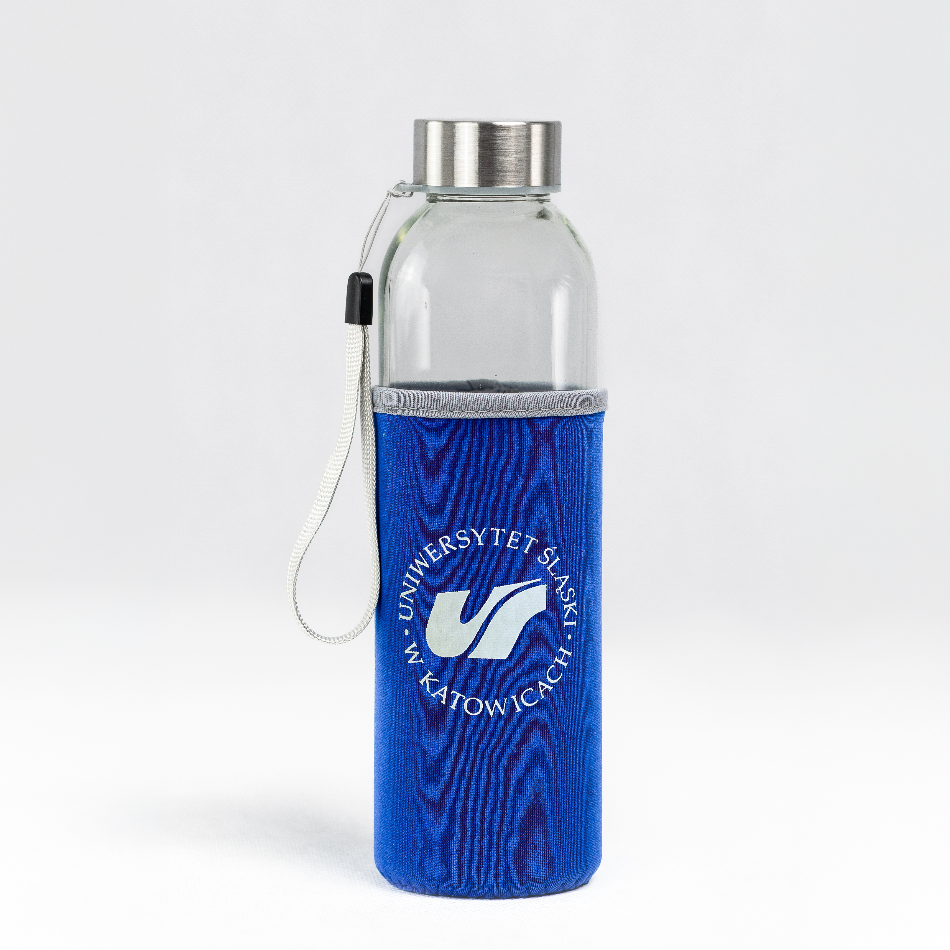 Butelka szklana z praktycznym, materiałowym pokrowcem w kolorze niebieskim, ozdobionym logo Uniwersytetu Śląskiego. Pokrowiec chroni szkło przed uszkodzeniami i ułatwia przenoszenie, a metalowa zakrętka gwarantuje szczelność. Elegancki i funkcjonalny gadżet, idealny na co dzień dla studentów, pracowników i sympatyków UŚ.